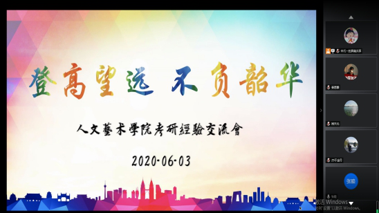 窗体顶6月3日晚,人文艺术学院利用腾讯会议网络平台召开2020年考研经验交流会。本次交流会邀请到我院2020年考研成功的七名同学为正在积极准备考研的同学们讲述自身经历、交流切身体会、分享宝贵经验。学院领导班子成员、各专业教研室主任、辅导员、17级备考学生们参加会议。会议由副书记张睦主持。