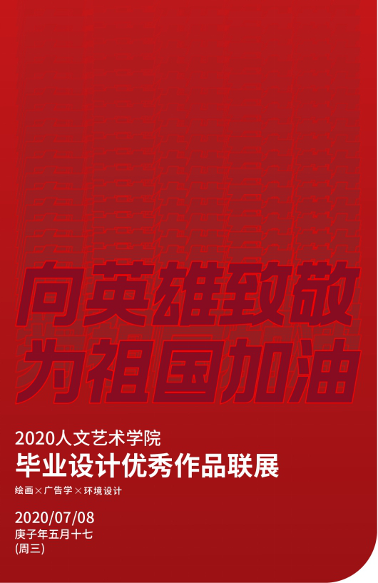 在此基础之上人文艺术学院从三个专业149名毕业同学的作品中优选了30幅优秀作品,在高考第二天7月8日举办了“向英雄致敬,为祖国加油——2020人艺学院绘画、广告学、环境设计毕业设计优秀作品联展”,任丽华院长为毕业展撰写了前言,对三个专业毕业生能够克服疫情带来的困难,高质量完成毕业创作给予充分肯定,同时也饱含深情寄语2020届毕业生,期望他们牢记校训和学校精神,奋发有为,为国家建设贡献出青年力量。