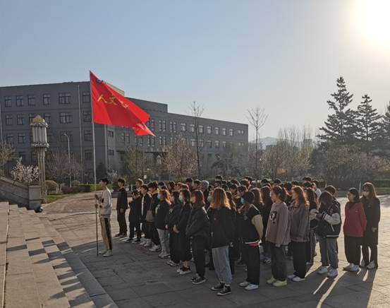 为了弘扬以史为鉴,继往开来的精神,深入推进党史学习教育,人文艺术学院于4月19日早6点40分,举行了以“以史为鉴,继往开来”为主题的升旗仪式。人文艺术学院全体分团委成员在书韵广场整齐列队,等待着庄严而神圣的升旗仪式的开始。