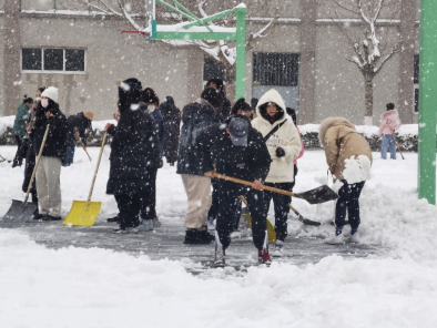 由于暴雪天气影响,学校主干道和操场积雪满地。为尽快铲冰除雪、消除隐患,同学们积极投入到积雪清扫队伍中。大家挥舞着铁锹和笤帚,你铲我扫,干劲十足。洁白的雪花映照着一张张因努力劳动而红彤彤的脸庞,一道道铲冰除雪的身影与美丽的校园相呼应,形成一幅幅温暖人心的美丽画面。
