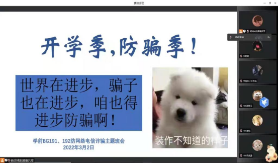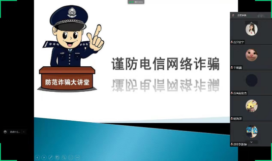 为增强学生安全防范意识,提高识骗防骗能力,预防并切实减少网络电信诈骗案件的发生,保障在学校生的财物安全,近日,人文艺术学院通过腾讯会议组织各班同学召开了“预防网络电信诈骗”主题班会活动。