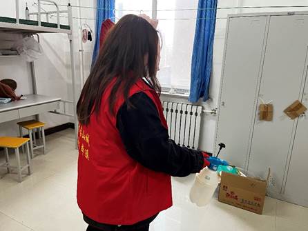 大战大考面前,青春力量从未缺席。由学生志愿者组成的志愿服务团队对本院学生寝室内进行了全方位的喷洒消毒以确保同学安全。志愿者们服务在第一线,以她们的热血和激情,协助学校全面做好疫情防控工作,并要求同学们要保持寝室环境卫生整洁,预防疾病传播,提高防范意识,保护自己的身体健康,积极配合学校各项疫情防控的相关要求,增强责任意识和防护意识,万众一心,严防严控,坚决打赢这场校园疫情保卫战。广大学生志愿者们主动亮身份、做表率,以青春之我、青春之力,践行着“爱满辽科,志愿有我”的青春誓言,在战“疫”前线筑起了一道青春长城。
