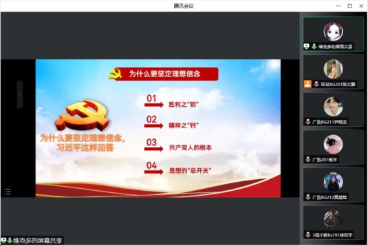 本次党课从四个层面展开,首先张书记和同学们探讨了一个问题,面对当下不同人对这个时代的不同看法以及大学生理想信念缺失的表现,作为新时代大学生今天为什么要坚定理想理想?然后,张书记讲述了理想和信念的含义,特征以及两者关系,通过案例和故事让同学们深入理解习近平总书记所说的理想信念就是共产党人精神上的“钙”的深层含义。接下来,张书记通过讲解习近平对理想信念教育的要求,让同学们意识到崇高的理想信念应当是心怀家国天下,全心全意为人民服务。最后,张书记和同学们探讨了如何做一名有品质的青年,她要求入党积极分子要以习近平新时代中国特色社会主义思想为指导,增强“四个意识”、坚定“四个自信”、做到“两个维护”,牢记初心,不忘使命,再接再厉,以更加坚定的理想信念、不懈的奋斗精神,脚踏实地,勤奋进取,争做新时代优秀大学生。